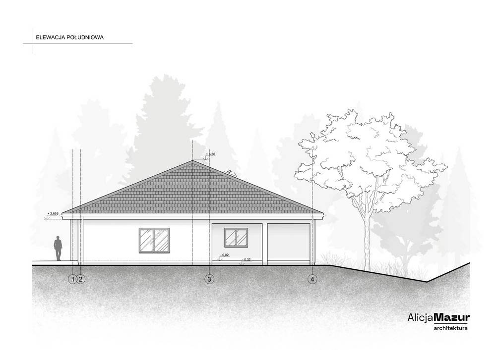 Budowa budynku mieszkalnego jednorodzinnego parterowego z dachem kopertowym, o przestronnym wnętrzu i minimalistycznej bryle.